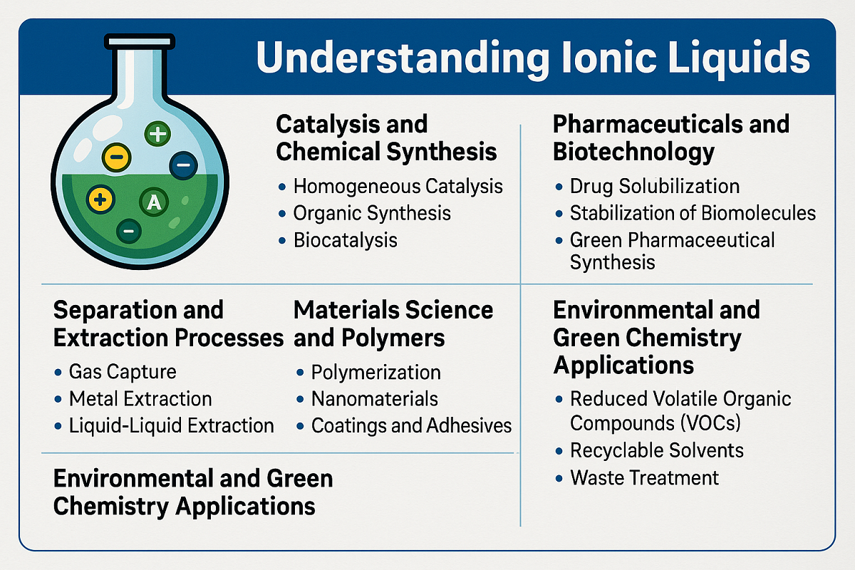 - Zelená farmaceutická syntéza: Iónové kvapaliny znižujú alebo eliminujú nebezpečné rozpúšťadlá pri syntéze aktívnych farmaceutických zložiek (API).